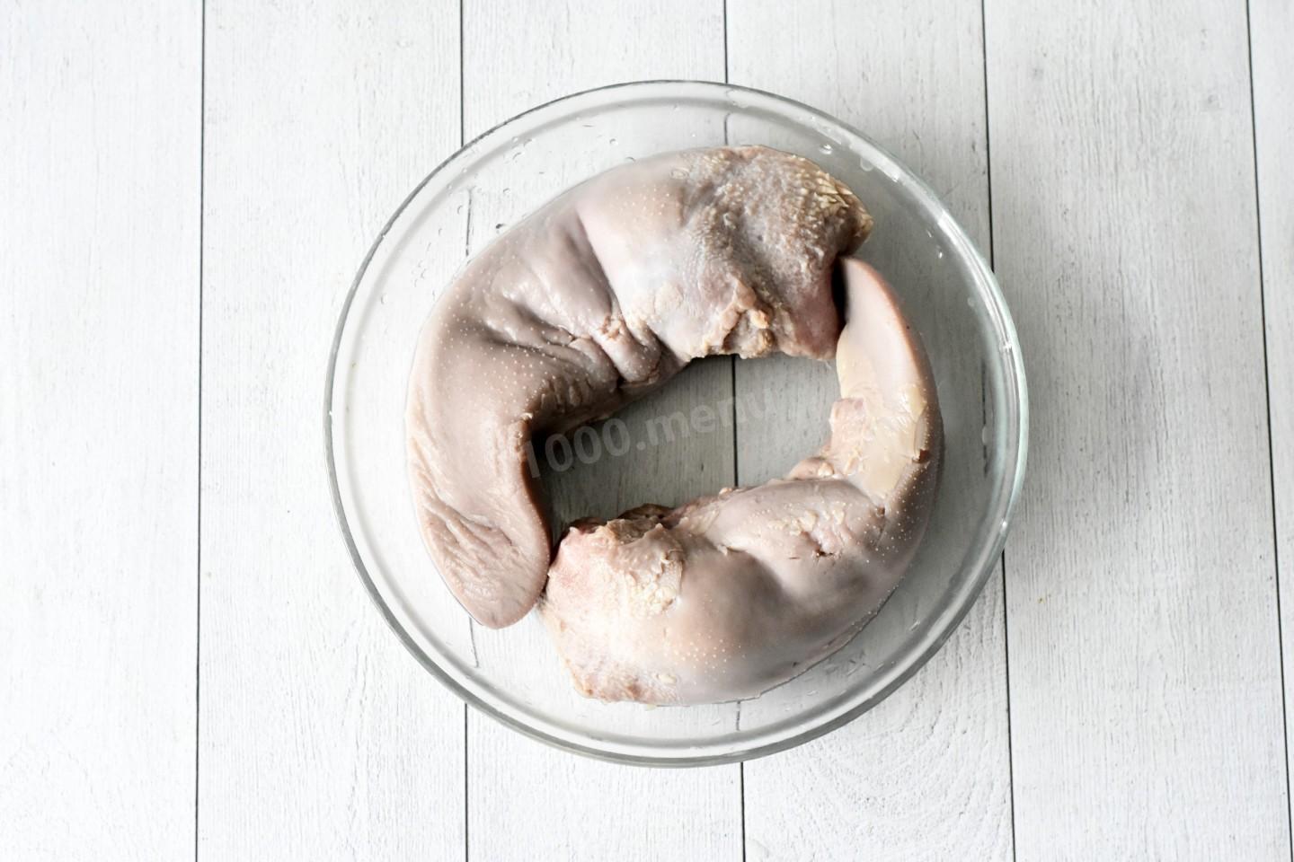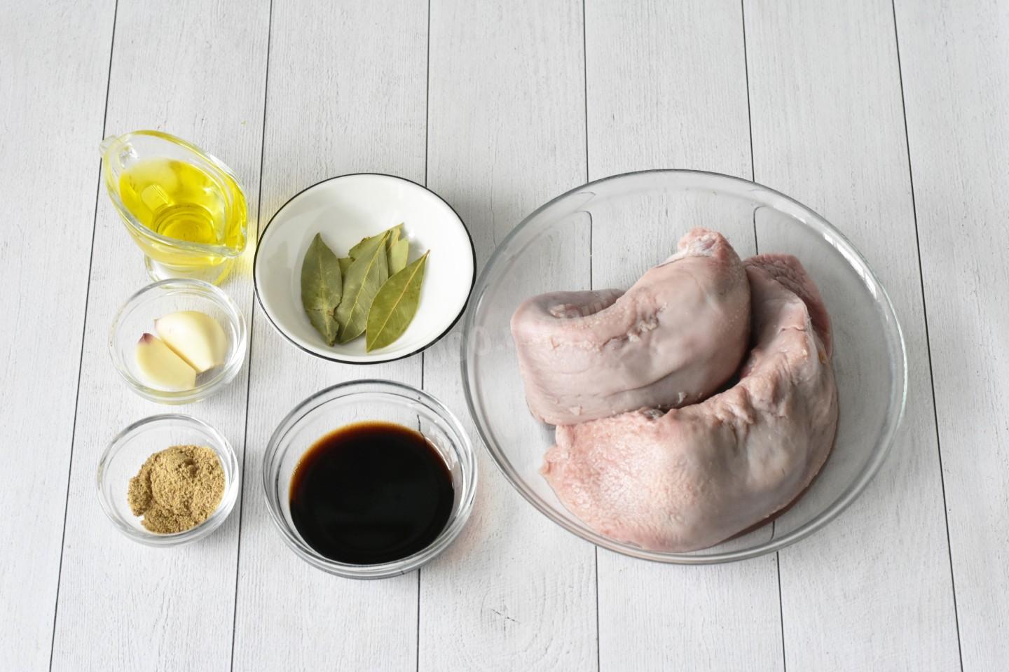Для начала подготовьте необходимые ингредиенты по списку. Свиной язык можете заменить на говяжий, но учтите, что время приготовления и калорийность могут измениться. Лучше использовать свежий язык, но если используете замороженный, заранее его разморозьте.