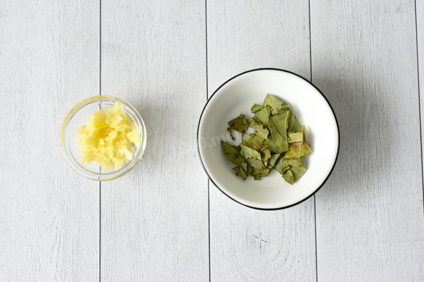 Возьмите зубчики чеснока, очистите их, ополосните и пропустите через пресс или мелко порубите ножом. Лавровые листья поломайте на небольшие кусочки руками — так они лучше отдадут аромат маринаду при запекании.