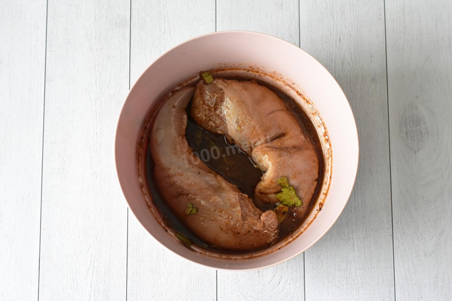Свиные языки залейте готовым маринадом и оставьте на примерно 1 час при комнатной температуре (или дольше в холодильнике). Периодически переворачивайте языки, чтобы они промариновались равномерно со всех сторон.