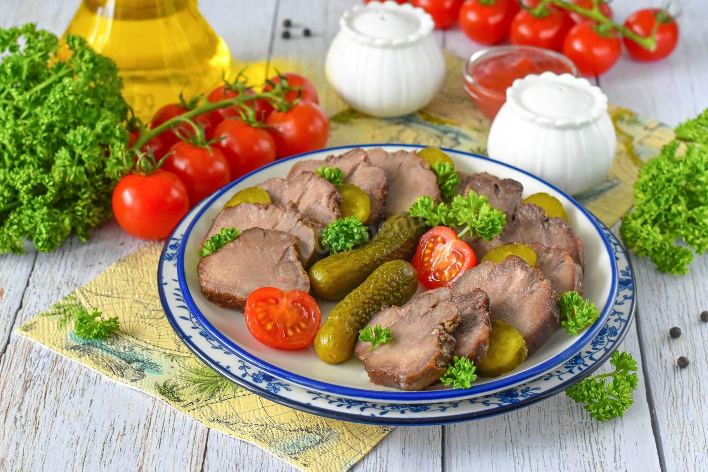 Свиной язык, запеченный в фольге в аэрогриле, нарежьте тонкими ломтиками, выложите на тарелку и подайте к столу с любым гарниром. Я подавала с отварным картофелем и маринованными огурцами. Также свиной язык можно подать в качестве закуски. Приятного аппетита!