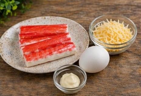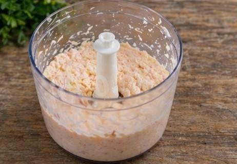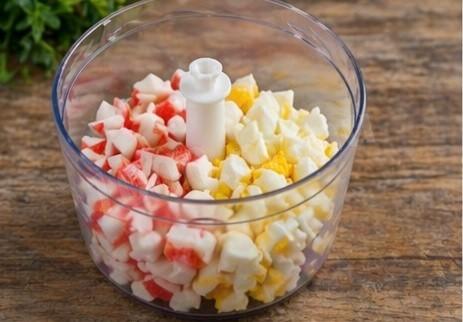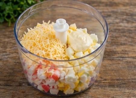 Сыр лучше натереть на мелкой тёрке. Это важный момент: так он равномерно распределится в массе и не даст крупных комков, а начинка получится более нежной и однородной. В чашу блендера отправьте нарезанные крабовые палочки, кусочки варёного яйца и подготовленный сыр. Добавьте чайную ложку майонеза. При желании можно слегка подсолить, но учитывайте, что крабовые палочки и майонез уже содержат соль.