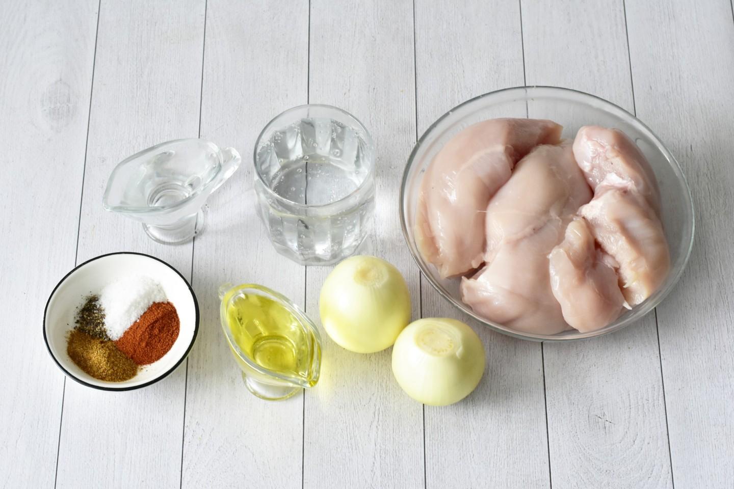 Для начала подготовьте необходимые ингредиенты по списку. Вместо куриного филе можете использовать любые другие части курицы: голени, окорочка, бедра. Но учтите, что время приготовления и калорийность изменятся.