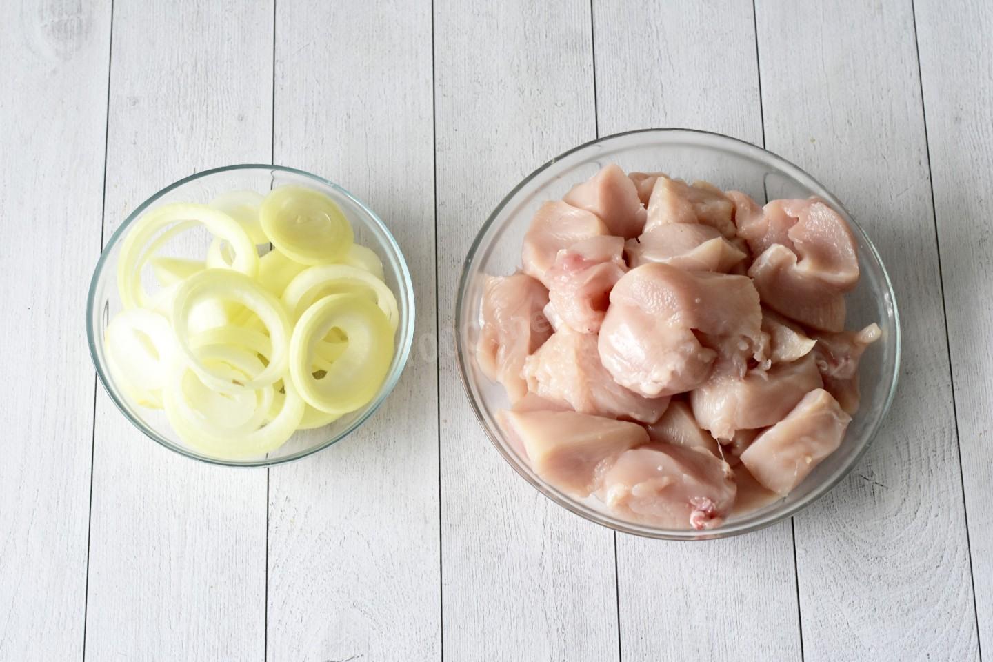 Куриное филе вымойте, обсушите бумажными полотенцами и нарежьте средними кусочками. Луковицы очистите и нарежьте кольцами.