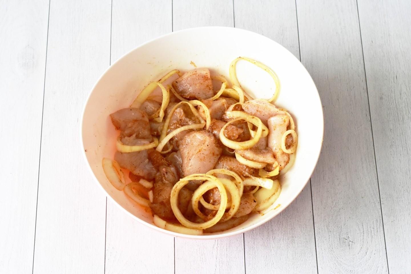 В миске соедините куриное филе, лук, специи для курицы, паприку, соль и молотый перец и все перемешайте, обминая лук руками, чтобы он пустил сок. Указанные в рецепте овощи и специи можете заменять или дополнять по вкусу.