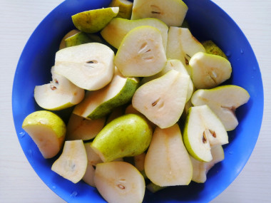 Груши у меня были средние и мелкие. Отобрав здоровые плоды, ополоснула их под проточной водой, затем разрезала на две части.