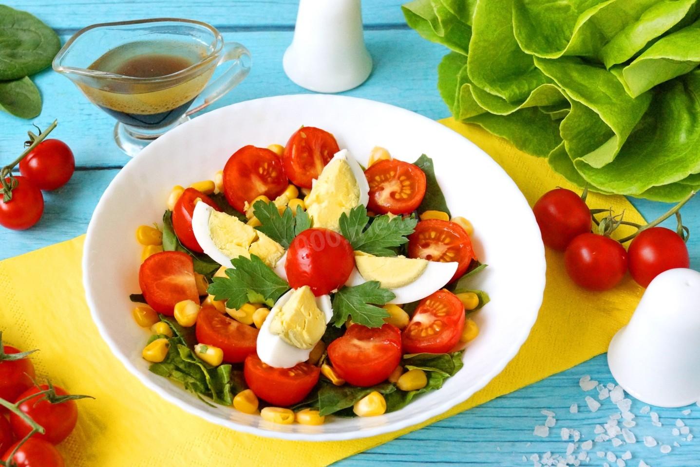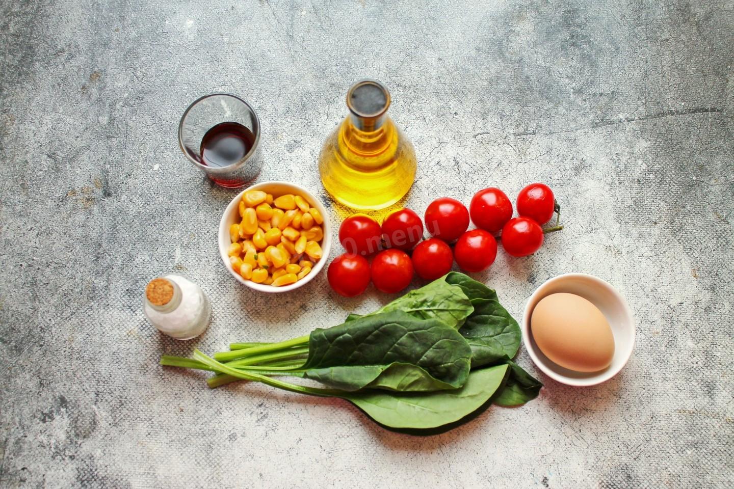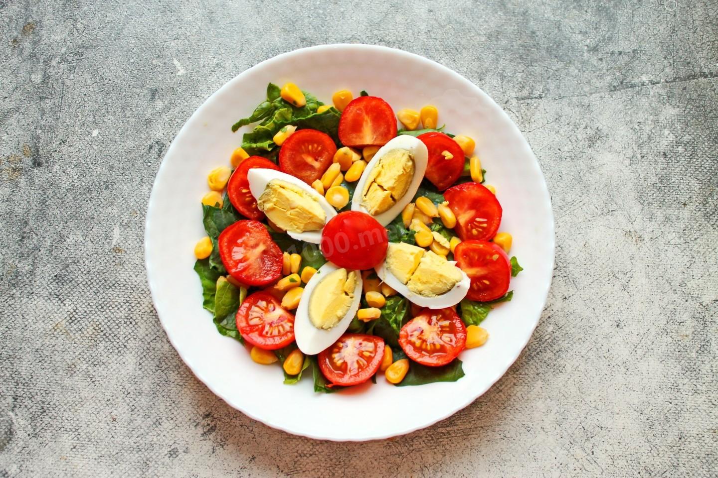 Зелень шпината порвите руками на куски и положите в салатник. Кукурузу откиньте на сито, чтобы удалить жидкость, и положите к шпинату. Черри разрежьте на две или четыре части и уложите сверху салата. Яйцо почистите, разрежьте на 4-6 частей, уложите в салатник и немного посолите. Салат полейте заправкой.