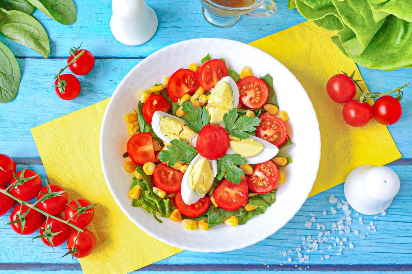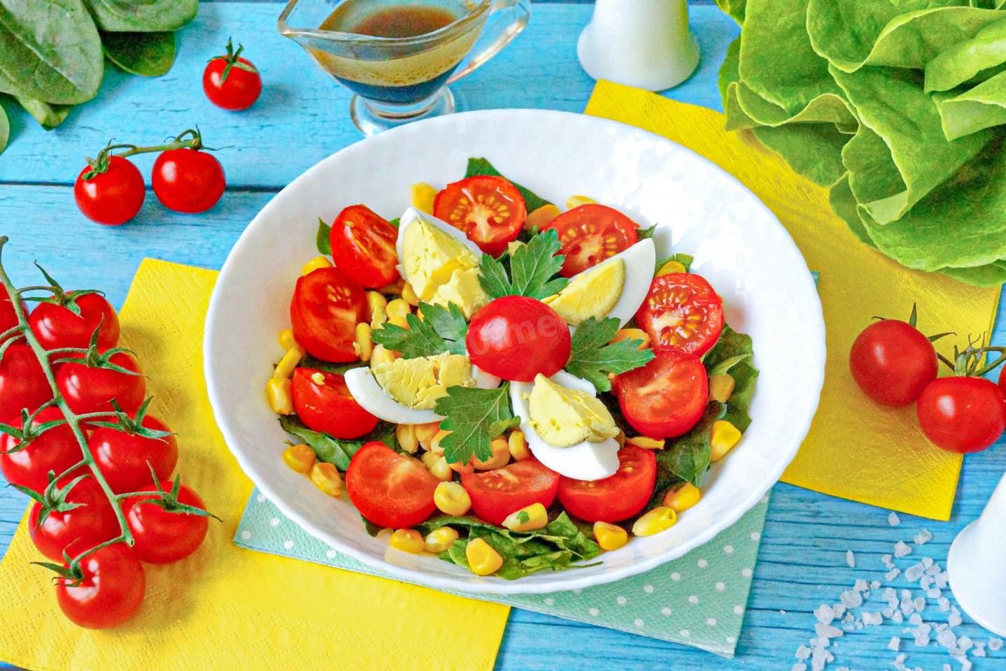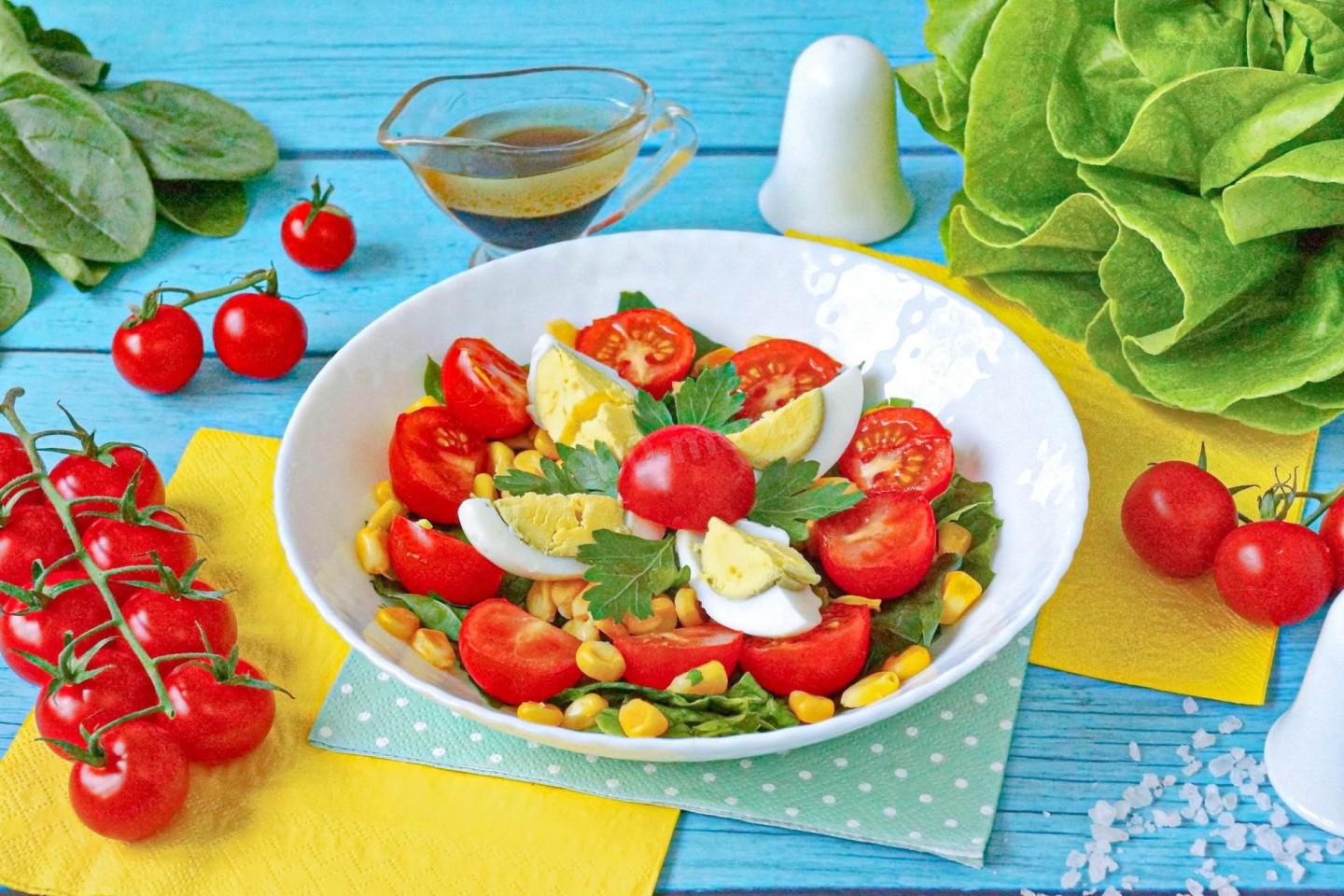 Зелень шпината порвите руками на куски и положите в салатник. Кукурузу откиньте на сито, чтобы удалить жидкость, и положите к шпинату. Черри разрежьте на две или четыре части и уложите сверху салата. Яйцо почистите, разрежьте на 4-6 частей, уложите в салатник и немного посолите. Салат полейте заправкой.