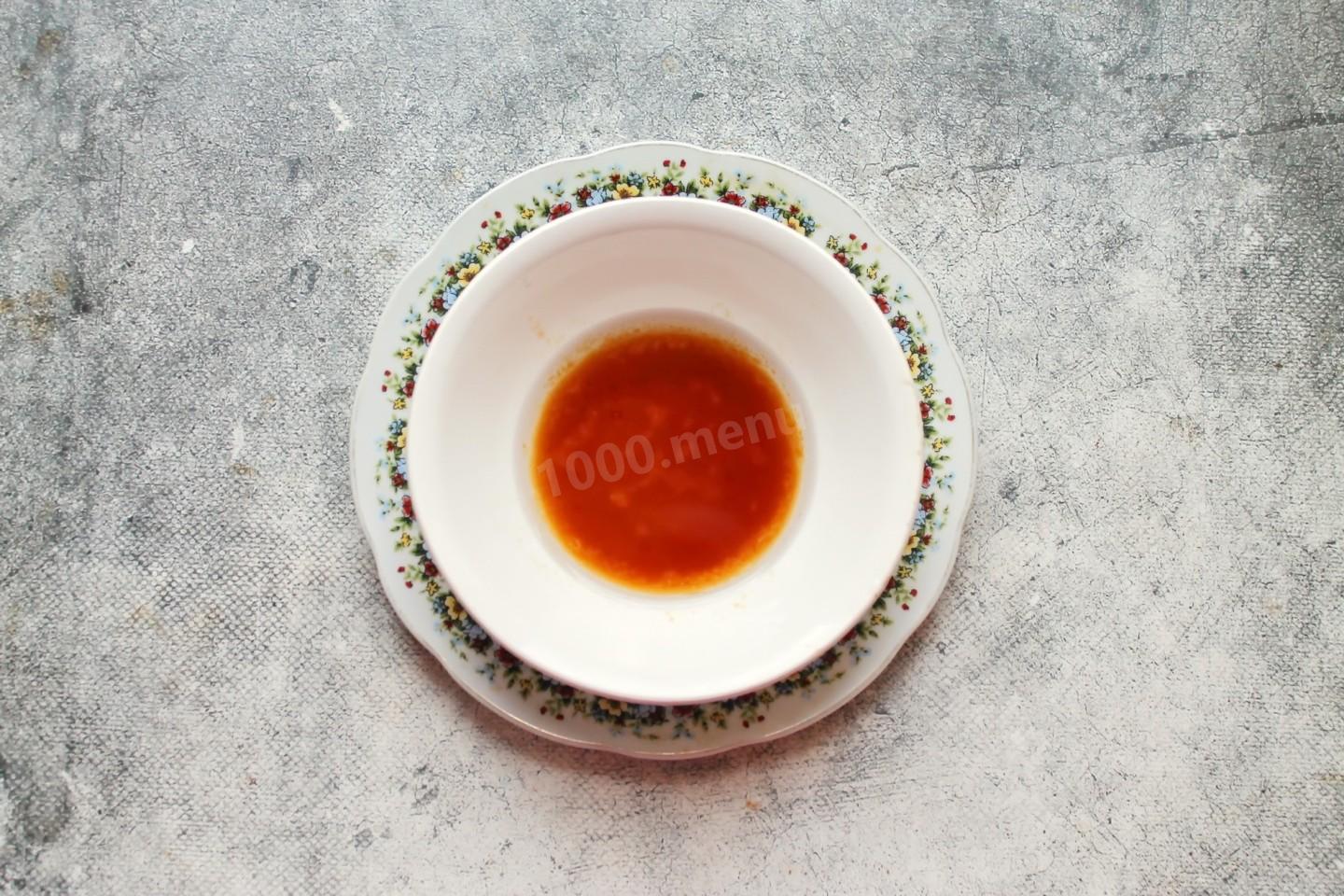 В небольшую емкость влейте растительное масло и смешайте с бальзамическим уксусом. Если такого уксуса нет, растительное масло можно смешать с соевым соусом и лимонным соком по вкусу. Также можно взять любой другой уксус по вкусу. Правильно пересчитать количество уксуса можно с помощью специального калькулятора.