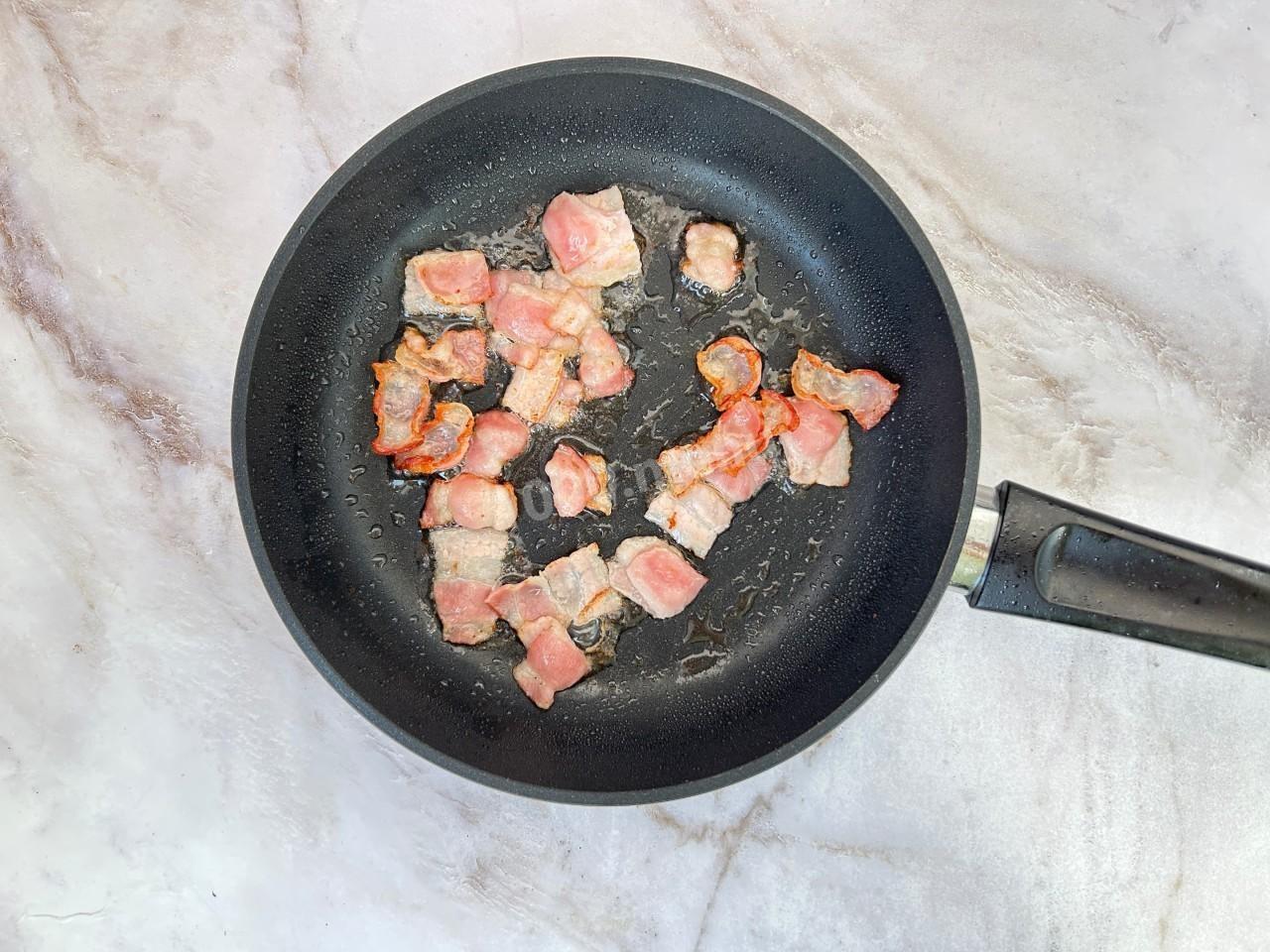 На сухой сковороде обжарьте бекон до румяной корочки, затем переложите его на тарелку.