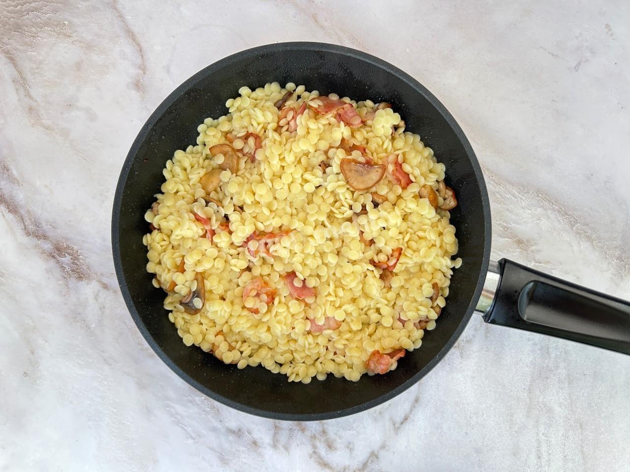 Верните бекон на сковороду, всыпьте птитим, посолите и поперчите по вкусу. Перемешайте и томите ещё 5-10 минут под крышкой на маленьком огне.