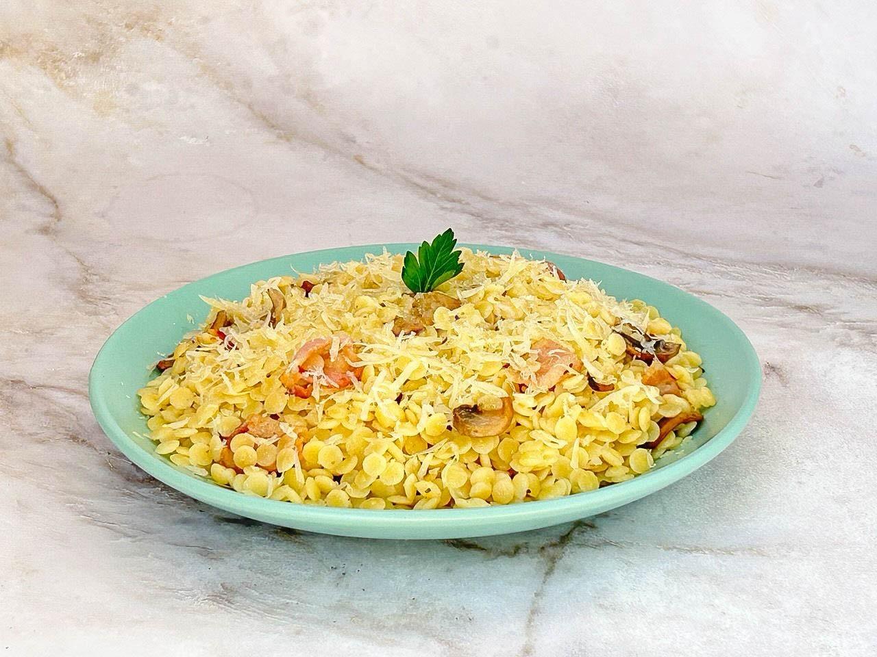 Птитим с беконом и грибами — сытное белковое блюдо. Бекон даёт энергию и витамины группы B, шампиньоны — лёгкость и калий, а сыр — кальций. Птитим (паста из твёрдых сортов пшеницы) надолго утоляет голод без скачков сахара.