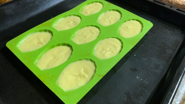Распределите тесто по специальным силиконовым формочкам в виде ракушек для печенья Мадлен. Если у вас форма металлическая, смажьте ее слегка сливочным маслом и присыпьте мукой. Поставьте форму в разогретую до 220℃ духовку на 5 минут. Затем уменьшите температуру до 200℃ и выпекайте еще 5 минут. Подробнее о том, как правильно выбрать форму для выпечки, подобрать время и температуру выпекания читайте в статьях в конце рецепта.