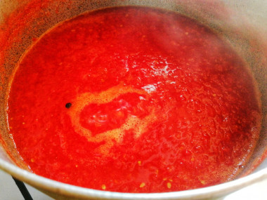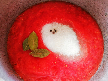 Томатное пюре переложите в эмалированную кастрюлю, добавьте сахар, соль, поставьте на небольшой огонь. Когда смесь закипит, добавьте лавровый лист и перец горошком, убавьте огонь до минимального и проварите томатное пюре около 15 минут при периодическом помешивании, чтобы томатная масса не пригорела ко дну кастрюли.