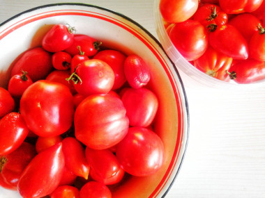 Как сделать консервированные помидоры в томатном соке на зиму? Подготовьте продукты. Для такой заготовки подойдут два вида томатов: маленькие крепкие, сортов, подходящих для консервации и крупные, мясистые, переспелые, которые будут использованы для приготовления сока. Мелкие помидоры помойте, дайте воде с плодов стечь. Крупные томаты также помойте.
