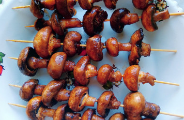 Приготовила по этому рецепту шашлыки из шампиньонов, поскольку грибочки внешне выглядят ну очень аппетитно. Такие шашлычки выигрышно смотрятся на столе, это правда, но вот их вкус так не порадовал. Скушали, но без особого удовольствия. За 15 минут они не пропеклись (хотя я использовала не крупные шампиньоны), внутри были сыроватыми, поэтому пришлось поставить их в духовку еще на некоторое время. Мне кажется, лучше было бы их сразу нарезать половинками или четвертинками (если грибы крупные), но в этом случае, при подаче они не выглядели бы уже так выигрышно.