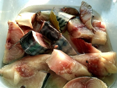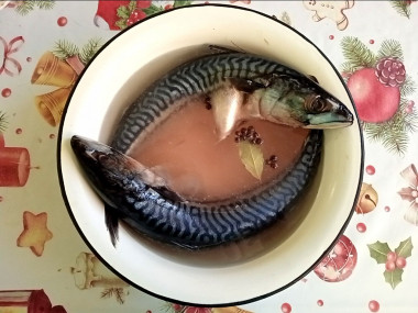 На сайте выбрала подходящий вариант скумбрии в рассоле целиком. Рассола сварила две порции и охладила. Рыбины у меня оказались очень большими и жирными. Из миски пытались вынурнуть, но я их прижала тарелкой и установила груз. Лучше бы, конечно, большую кастрюлю взяла. Но все были заняты). Потом уже подумала, что надо было головы удалить для удобства. Тем не менее посол получился удачным! За два дня скумбрия просолилась хорошо. Рыба была толстенькой, поэтому держала ее в рассоле полный срок. За это время кровь вышла и мясо стало светлым и плотным. Рыба напиталась ароматом душистого перца и лавра. На мой вкус в меру солёная. Перед подачей я разрезала тушки на стейки, а затем ещё пополам для удобства. И подержала в смеси растительного масла и винного уксуса пол часа.