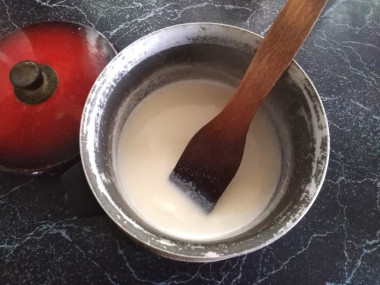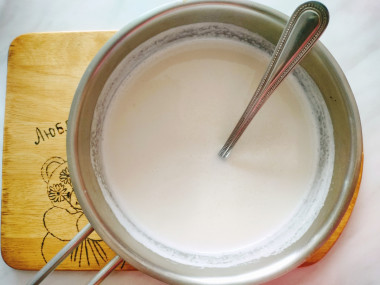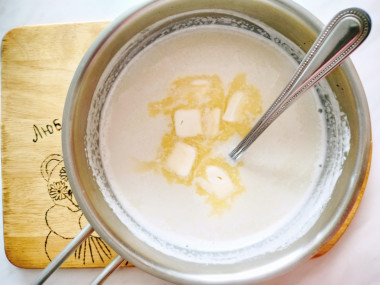 Тонкой струйкой влейте молоко в сотейник, активно мешая будущую кашу. Именно этот секрет — добавлять не крупу в жидкость, а наоборот - поможет избежать появление комочков.