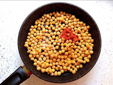 Когда нут прокалится, всыпьте паприку, чили, карри, молотый перец и соль. Перемешайте специи с нутом и жарьте, помешивая, еще 5 минут.