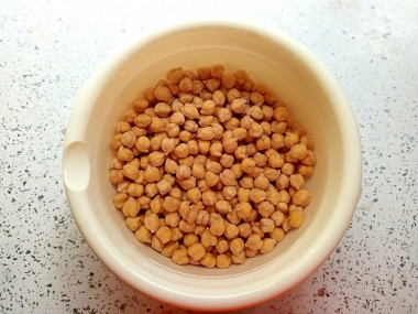 Нут замочите на ночь в большом количестве холодной воды. Во время замачивания нут может издавать легкие щелчки, которые слышны даже через воду. Поэтому если ночью услышите из кухни непонятный периодический треск, то не пугайтесь - это нут. Если эти щелчки слишком мешают, можно переставить нут в духовку - за герметично закрытой дверцей ничего не слышно.