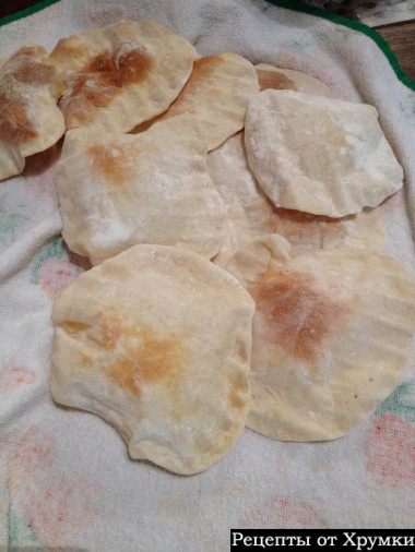 Выпекаем 2- 3 минутки,пока лепешки не поднимутся и не раздуются. Сразу вынуть и завернуть в полотенце, чтобы лепешка высохла. Если лепешку выпекать дольше, то она подрумянится и станет хрустящей