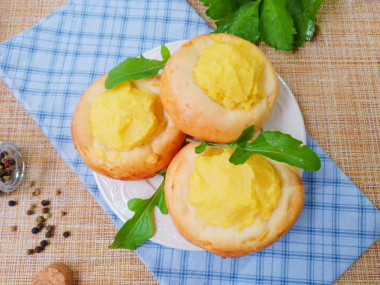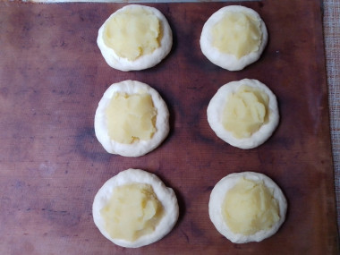 Заполните углубления картофельной начинкой. Я выложила пюре с помощью кулинарной насадки. Можно просто воспользоваться ложкой. Смажьте бортики ватрушек яичной смесью.
