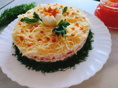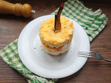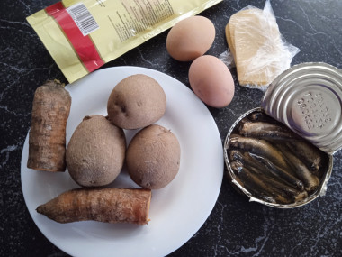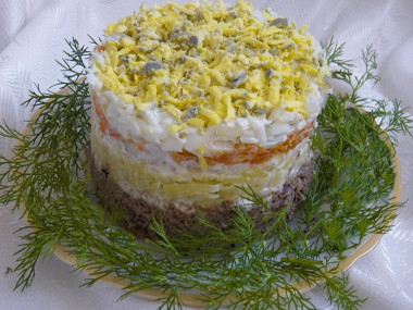 Сделала рыбный салат по этому рецепту. Заранее отварила картофель, морковь и яйца. Остудила и почистила. Потёрла все ингредиенты на тёрке с крупными отверстиями. Шпроты в масле размяла вилкой, оставив несколько для украшения. Укроп не использовала за неимением свежего. От себя ещё в салат добавила репчатый лук. Выложила всё слоями, используя обрезанную пластиковую бутылку диаметром 9 см. Слой картошки немного полила маслом от шпрот, чтоб было не сухо. Каждый слой смазывала майонезом 67%. Получилось две хороших порции. Салат постоял пару часов холодильнике. Очень красиво и аппетитно.