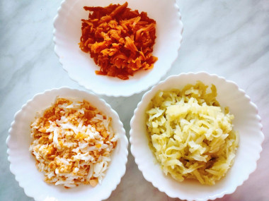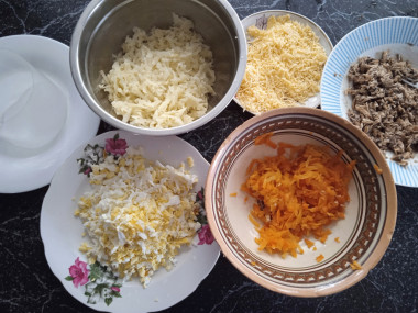 Сыр натрите на средней терке. Выбирайте качественный продукт без использования растительных жиров. Последним слоем выложите тертый сыр.