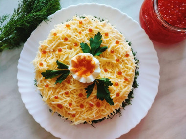Сегодня решила приготовить салат Океан со шпротами. Рецепт этого салата очень простой и быстрый, главное отварить яйца и овощи. Я сварила 3 яйца, чтобы из половинки одного сделать украшение. Морковь, картошку и яйца натерла на крупной терке, так, на мой взгляд, овощи дают меньше сока и салат не получается слишком водянистым. Выкладывала салат в кулинарное кольцо диаметром 16 сантиметров. Слой с укропом делать не стала. Украсила половинкой яйца, листиками петрушки и икринками. Убрала на несколько часов в холодильник, чтоб слои лучше пропитались. Салат получился изысканным и нежным. Все ингредиенты очень гармонично сочетаются. Мне и моей семье понравился. Съели за один раз