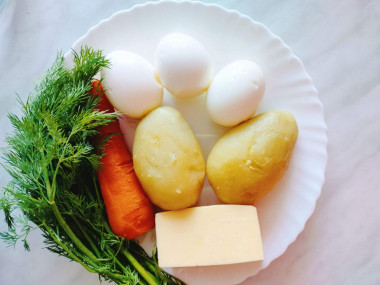 Морковь, картофель и яйца отварите, остудите и очистите. Как варить яйца вы узнаете прочитав статьи в конце рецепта. Укроп вымойте в проточной воде, обсушите бумажными полотенцами и измельчите ножом.