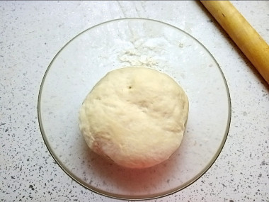 Выложите тесто на рабочую поверхность (у меня силиконовый коврик). Муки я не подсыпала, так как тесто совсем не липло ни к столу, ни к рукам. Обомните. Разделите на две части. Одну часть скатайте в колбаску. Вторую отправьте назад в миску и прикройте полотенцем, чтобы не обветрилось.