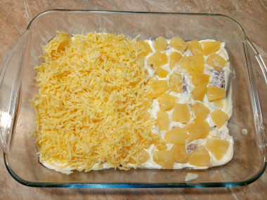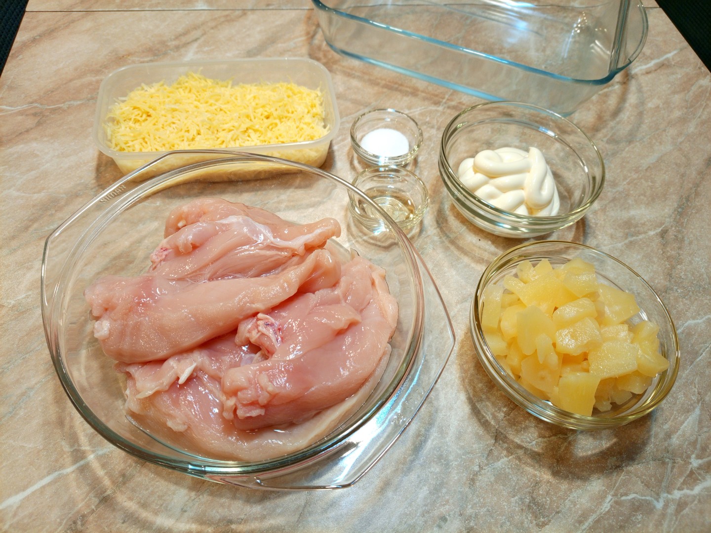 Рецепт оказался очень легким. Пока духовка разогревалась, успела всё подготовить. У меня было филе куриной грудки, порезала его на небольшие куски и немного отбила. Помидорок у меня не было, готовила без них. Взяла ананасы в банке кусочками, аккуратно достала ложкой-шумовкой количество по весу, указанному в рецепте. Сыра взяла чуть больше – мы его любим.