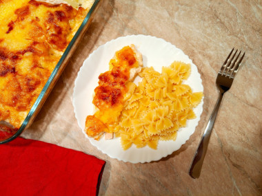 Честно, сначала сомневалась в сочетании ананасов с мясом, боялась, что будет слишком сладко, оказалось совершенно зря... Курочка получилась очень нежной и совсем не сухой. Ананасы дали интересный кисло-сладкий привкус. Сырная корочка – это просто восторг. Подавала курицу и с картофельным пюре, и с макаронами – в обоих случаях было вкусно.