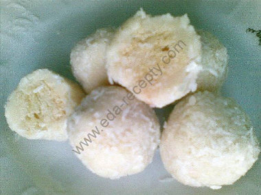 После охлаждения лепим шарики внутри с орешком и обкатываем в стружке.