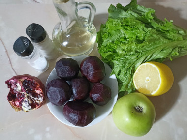 Как сделать салат свекла гранат? Подготовьте продукты. Свеклу возьмите сладких сортов, она лучше подойдет для салата. А вот яблоко берите кисло-сладкое, чтобы оно оттеняло вкус свеклы. Вместо рукколы подойдут любые салатные листья. Масло — любое растительное, и оливковое холодного отжима, и подсолнечное с запахом или без.