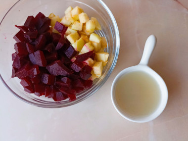 Сложите кубики свеклы и яблока в одну миску. Залейте их заправкой, перемешайте.