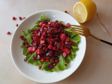 Соберите салат. На тарелку выложите помытые и обсушенные салатные листья. На них разложите кубики свеклы и яблока. Посыпьте салат сверху зернами граната.