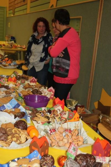 Ну, что, наконец-то могу показать одно из предрождественских мероприятий, о которых я тут рассказывала (общедеревенский базар в этом году я благополучно проболела). Так выглядит один из столов на школьном празднике. В данном случае выпечка не продается, это как бы праздничное угощение, народ бросает пожертвования в специальные миски (видите такую фиолетовую пластмассовую?). Потом еще размещу фотки с этого мероприятия в комментах к рецепту, который я туда пекла. А пока можете поотгадывать, что тут мое