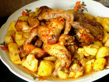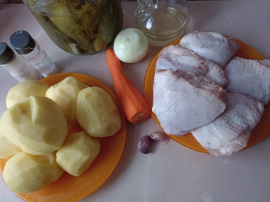 Я люблю "костлявые" части курочки, к тому же при тушении такие кусочки придают картошке какой-то особый нежный вкус. Использовала я почти всю курицу, кроме грудки. Обжаривать решила все в мультиварке, чтобы не пачкать сковороду). Сначала подрумянила курицу в два захода, на это ушло 20 минут в режиме "жарка". Потом 5 минут обжарила овощи (лук полукольцами, морковь брусочками). Картошка у меня молодая, сама по себе вкусная, нарезала ее дольками. Кроме рассола от огурцов добавила столько же горячей воды. Для аромата посыпала все это приправой для курицы. Зная свою мультиварку, выставила режим "тушение" на 40 минут. И еще минут 20 картошка с курицей томились на подогреве.
