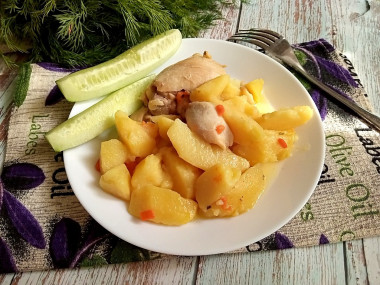 Спустя указанное время мультиварка издаст звуковой сигнал, говорящий о том, что блюдо готово. Тушеную курицу с картошкой разложите по тарелкам и подавайте к столу. Приятного аппетита!
