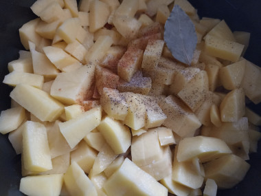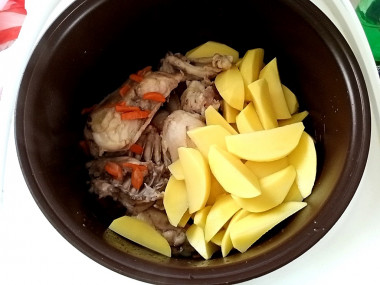 Картофель очистите, ополосните и нарежьте крупными кусочками. Выложите картофель на курицу. Добавьте очищенный и нарезанный чеснок. Влейте рассол. По вкусу посыпьте соль и специи. Перемешайте и закройте крышку. Включите режим "Тушение" на 1,5 часа. Точное время приготовления зависит от особенностей работы вашей мультиварки.
