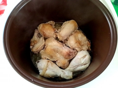Курицу, порубленную на кусочки, обжарьте на сковороде на сильном огне со всех сторон, чтобы она стала немного золотистого цвета. Затем переложите обжаренную курицу в чашу мультиварки. О том, как подобрать идеальную сковороду, а также как правильно выбрать растительное масло, читайте в отдельных статьях, ссылки в конце рецепта.