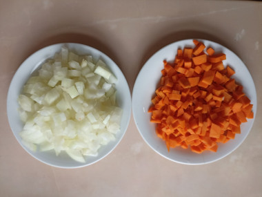 Лук и морковь очистите, ополосните и измельчите. В сковороде после курицы обжарьте лук и морковь 3-5 минут.