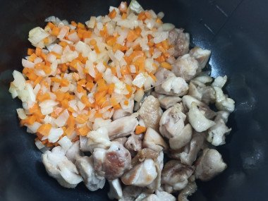 Переложите обжаренные овощи в чашу мультиварки к курице.
