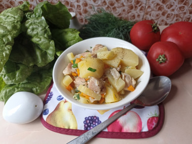 Приготовила курицу тушёную с картошкой в мультиварке. Использовала мякоть с куриных бедрышек, обжарила ее на сковороде, переложила в чашу мультиварки, на этой же сковороде обжарила лук и морковь и также переложила в мультиварку. Затем к мясу и овощам положила нарезанный ломтиками картофель, соль, специи, влила огуречный рассол, немного горячей воды ( хотелось чтобы получилось побольше соуса). Готовила в режиме "тушение" 30 минут ( в моей мультиварке тушение происходит под давлением, поэтому время приготовления значительно сокращается). Получилось очень вкусное, сытное, аппетитное блюдо. Спасибо за рецепт, Юлия М!