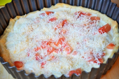 Поставьте пирог в духовку и пеките около 30 минут. Точное время будет зависеть от особенностей вашей духовки и толщины киша. Верх должен зазолотиться. Готовый киш выньте из духовки.