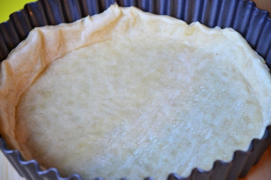 Через полчаса достаньте тесто и раскатайте в пласт, толщиной около 5мм. Ориентируйтесь также на размер формы — тесто должно покрыть дно и бортики. Удобно раскатывать его сразу на листе пергамента, он пригодится в дальнейшем при выпечке.