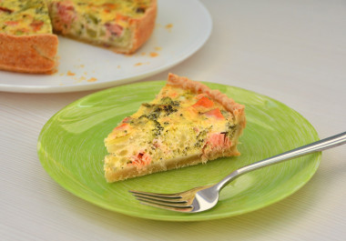 Но вот пирог я держала в духовке минут 50 вместо 30. Думаю, дело несомненно в высоте уровня начинки, коей на мою форму, возможно, хватило бы и поменьше. Но тем не менее, киш зазолотился сверху и я поняла, что он готов. Очень красивый и ароматный получился пирог на мой взгляд. При разрезе подтвердились мои опасения касательно теста, дно получилось плотнее, чем должно быть, наверное. Но должна отметить, что на вкус это не так уж и повлияло. Тесто не ощущается тугим или плотным. Суховато, но вкусно! Думаю, если бы делала масляно-мучную смесь без блендера, то кусочки масла были бы в итоге в тесте крупнее, что позволило бы ему остаться более "воздушным", скажем так. Начинка получилась вкусная! Брокколи мы любим, все ингредиенты сочетаются прекрасно. Сразу для себя отметила, что слабосоленая форель после термоотработки стала еще немного солоней, а значит, верно, что я не солила начинку. Поэтому в следующий раз я буду использовать несоленую рыбу.