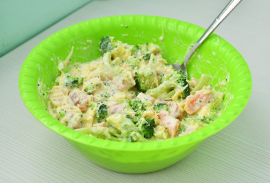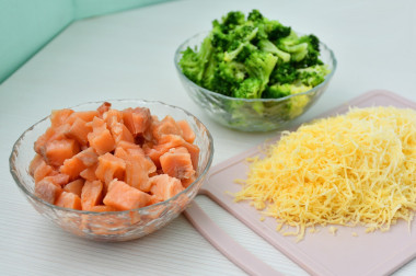 А тем временем приготовьте начинку. Приготовьте продукты для нее. Рыбу можете взять любую красную — семгу, кету, горбушу. Брокколи подойдет как свежая, так и замороженная. Размораживать ее предварительно не нужно.