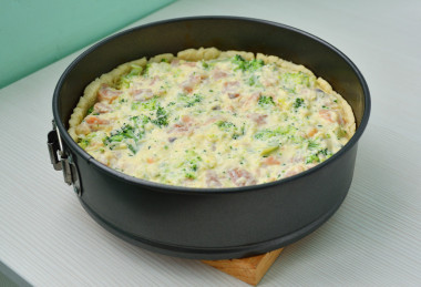 К ужину решила приготовить киш с лососем и брокколи по этому рецепту. Из лососевых рыб у меня в качестве начинки было слабосоленое филе форели. Брокколи была замороженная. Я использовала разъемную форму диаметром 22 см. Не стала рубить масло вместе с мукой ножом, а воспользовалась блендером