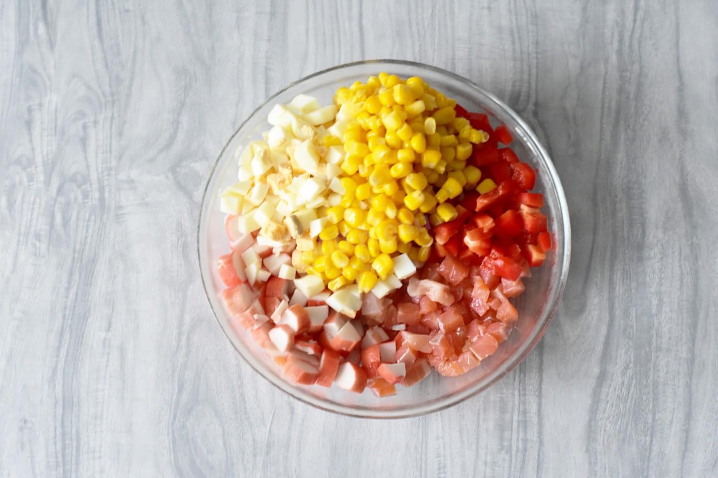Яйца сварите вкрутую, охладите и очистите. Нарежьте небольшими кубиками. Красную рыбу разрежьте на две неравные части. Более широкая часть в районе хребта понадобится для украшения. Оставшуюся часть нарежьте небольшими кубиками. Крабовые палочки также нарежьте кубиками. Болгарский перец очистите от семян и плодоножки и нарежьте небольшими кубиками. С консервированной кукурузы слейте жидкость, зерна обсушите.